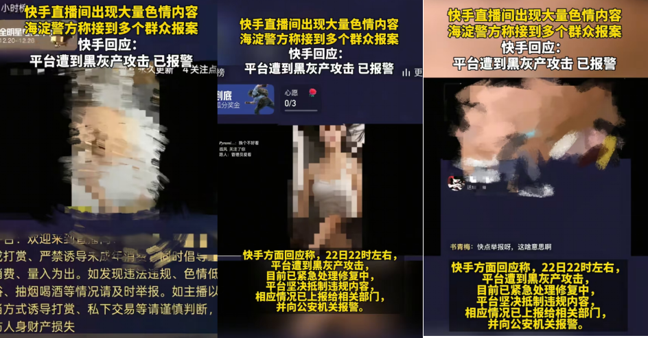12月22日22时左右,快手平台遭黑灰产攻击,网友反映直播间出现大量色情内容,随后大量直播间被封禁;23日0时之后,快手APP“直播”板块已无任何内容。快手后续回应并在12月23日午间港交所公告中明确,已第一时间启动应急预案,经处置直播功能已逐步恢复正常,其他服务未受影响,平台坚决抵制违规内容,已向公安机关报警并上报相关部门,强烈谴责黑灰产违法犯罪行为,将采取适当法律补救措施保障公司及股东权益。